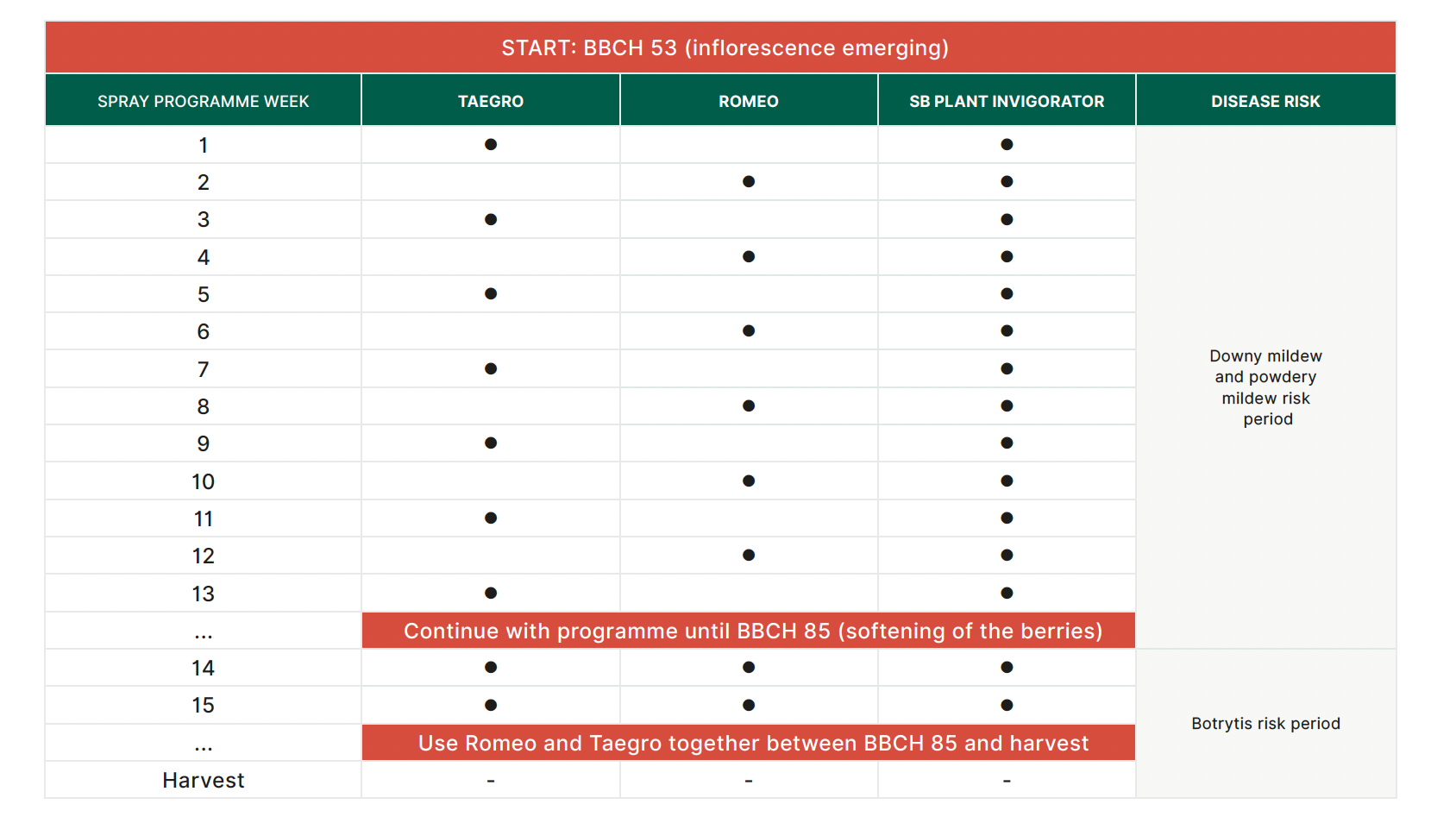 Once BBCH 85 (softening of the berries) is reached, Taegro and Romeo are applied together to give strong protection of the grapes as harvest approaches. This is due to increased risk of botrytis when sugar levels are high.